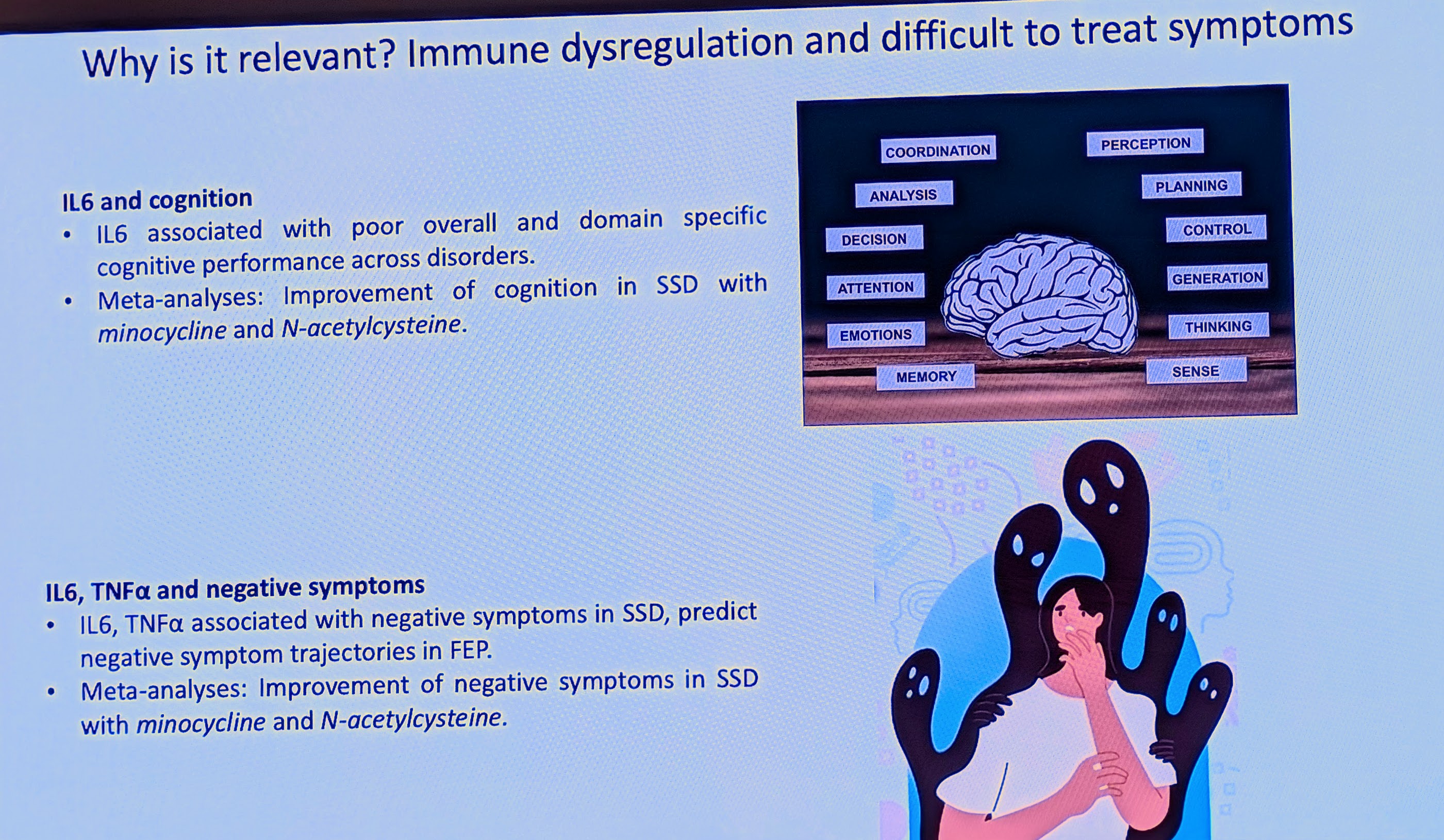Deze immuunontregeling is klinisch relevant: het is gekoppeld aan therapieresistentie en aan moeilijk te behandelen symptomen zoals cognitieve problemen en negatieve symptomen (bijv. initiatiefverlies). Aanvullende behandelingen met ontstekingsremmende middelen (zoals celecoxib en minocycline) hebben in studies effectiviteit laten zien.